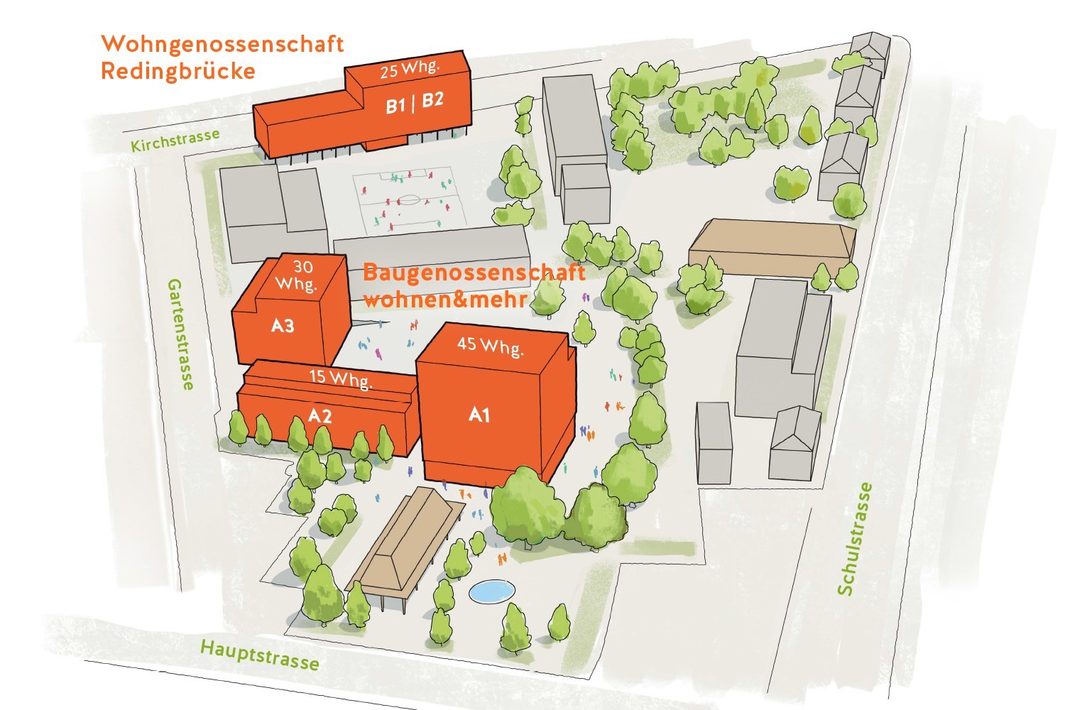 Am Zentrumsplatz werden zwei Neubauten entstehen: ein grösserer Bau mit 45 Wohnungen (mehrheitlich Geschosswohnungen, einzelne Duplexwohnungen) und ein kleinerer Bau mit 15 Wohnungen (Fokus jüngere Familien, Duplexwohnungen). Das ehemalige Schulgebäude aus dem Jahr 1962 wird zu einem Wohnhaus mit 30 Kleinwohnungen (gemeinschaftliches Wohnen, Fokus Singles, Paare, Kreative, Wohnen und Arbeiten) umgenutzt. Im Neubau an der Kirchstrasse, den wir für die WG Redingbrücke erstellen, entstehen 25 Wohnungen, mit denen die Genossenschaft ihren fehlenden Bedarf an Familienwohnungen ergänzen kann. Beim Aussenraum setzt die Gemeinde auf Fuss- und langsamen Veloverkehr. Der Zentrumsplatz wird einen Baldachin erhalten, der gemeinsam mit den bisher bekannten Angeboten (Märkte, Open-Air-Konzerte und Chilbi) ein kommunaler Treffpunkt für die Bevölkerung sein soll.