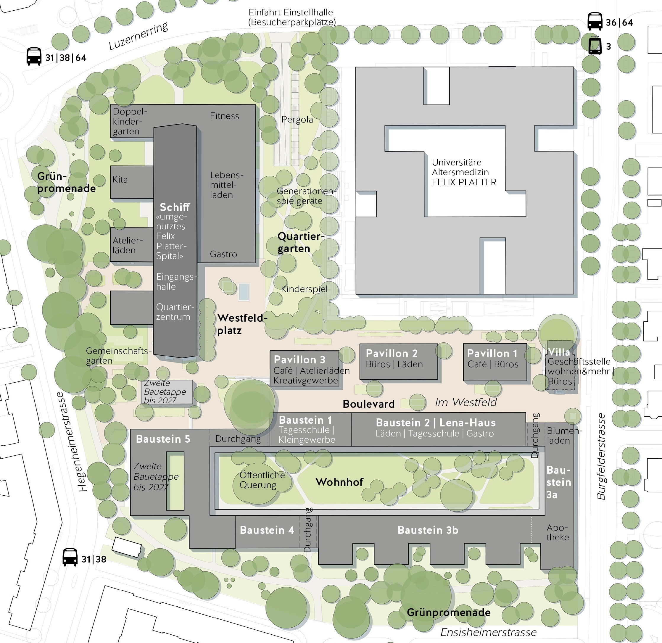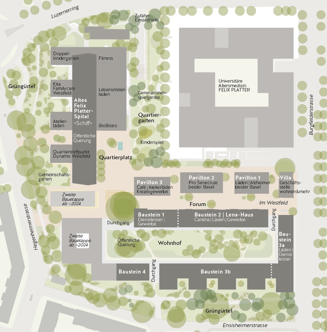 Auf dem bis 2019 vom Felix Platter-Spital genutzten Areal entsteht im Westen Basels ein neues, lebendiges Stück Stadt mit rund 525 Genossenschaftswohnungen. In einer ersten Bauetappe wurden bis Anfang 2023 durch die Umnutzung des ehemaligen Felix Platter-Spitals und durch diverse Neubauten 459 Wohnungen sowie unterschiedlich grosse Gewerberäume und Räumlichkeiten für öffentliche Nutzungen realisiert. Durch die Sanierung des alten Verwaltungsgebäudes sind weitere Gewerberäume entstanden. In der zweiten Bauetappe werden bis 2027 nochmals 66 Wohnungen sowie Flächen für Quartiernutzungen und Dienstleistungen hinzukommen. Die Transformation ist in der Publikation «Westfeld Basel – Gemeinschaftlich Wohnen Arbeiten Leben» dokumentiert.