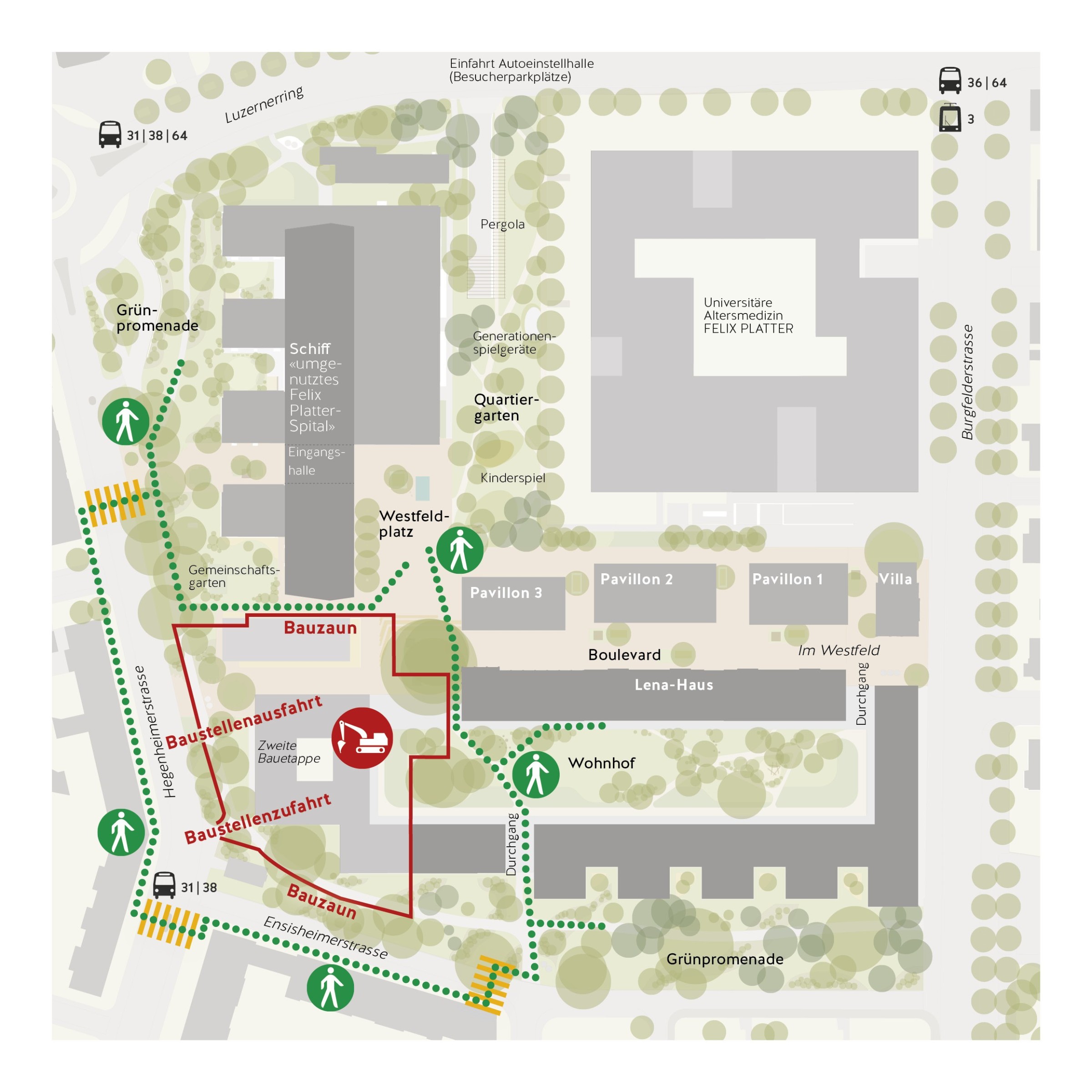 Der Baustellenverkehr findet via Kreisel Luzernerring statt, die Zu- und Ausfahrt in die Baustelle ausschliesslich via Hegenheimerstrasse. Die Bauarbeiten führen aus sicherheitstechnischen Gründen zu partiellen Sperrungen in der Grünpromenade an der Ensisheimer-/Hegenheimerstrasse. Eine sichere Alternativroute für Fussgänger wurde eingerichtet (siehe Plan).